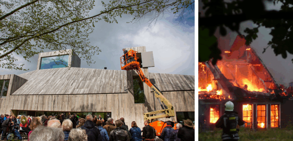 Links: Opening van Het Groene Huis, door burgemeester Bolsius,. Rechts: Brand in de boerderij.