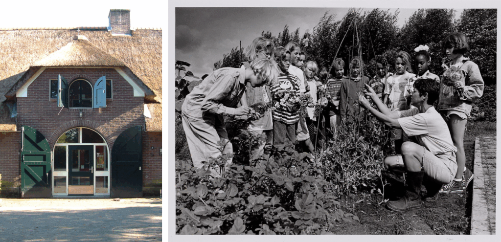 Links: De (verbouwde) boerderij van CNME. Rechts: Les in de schooltuin van CNME.